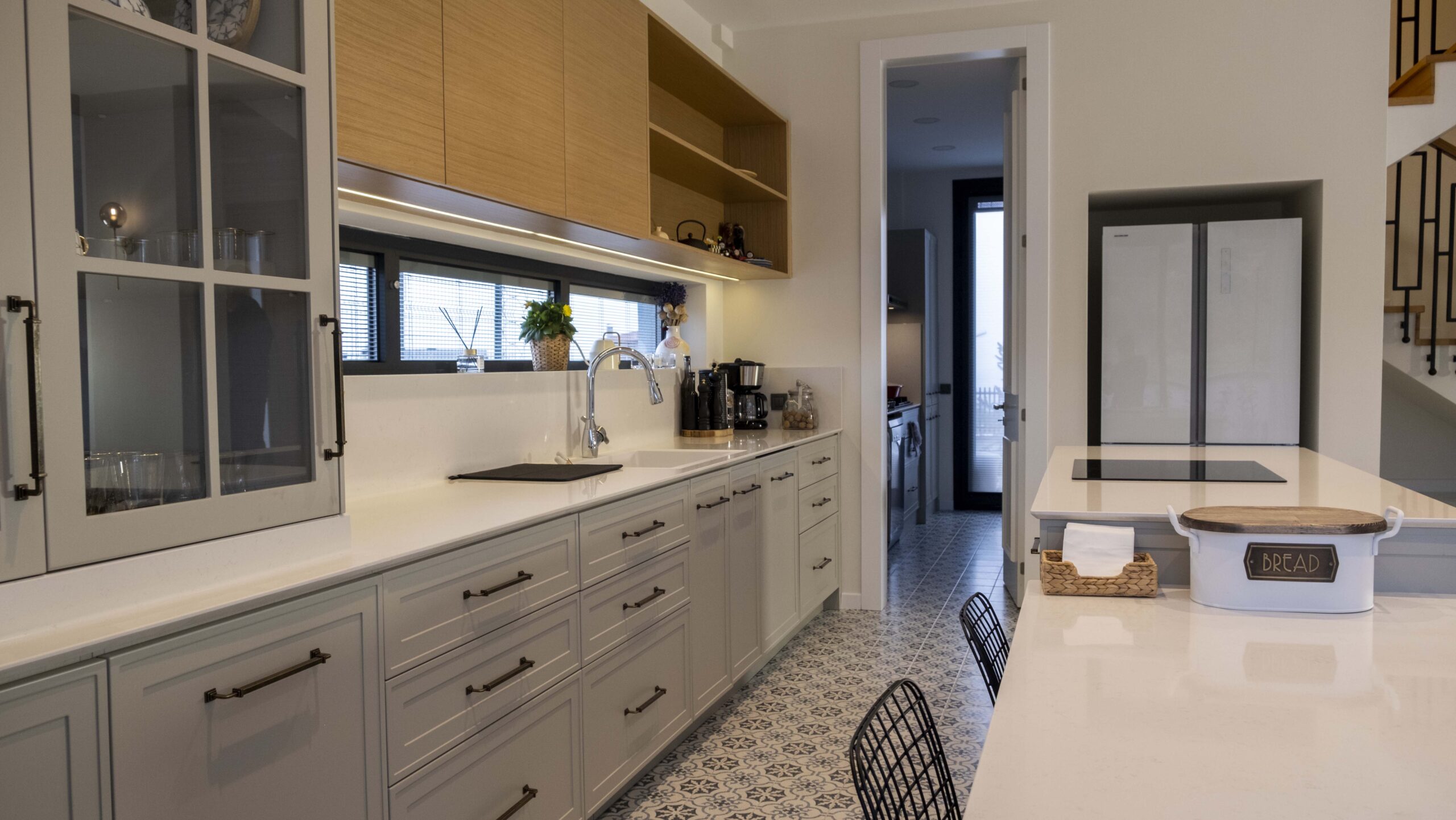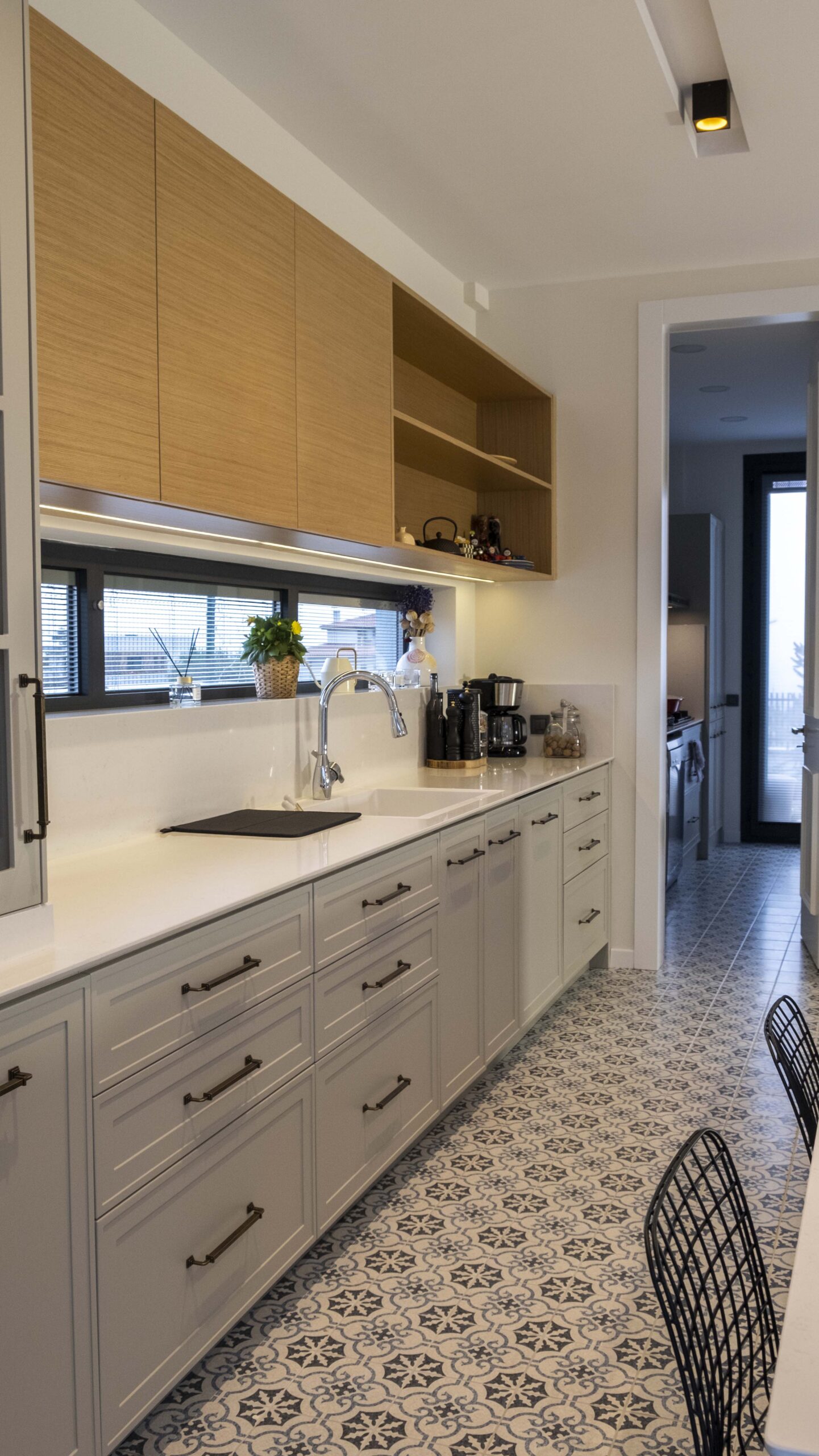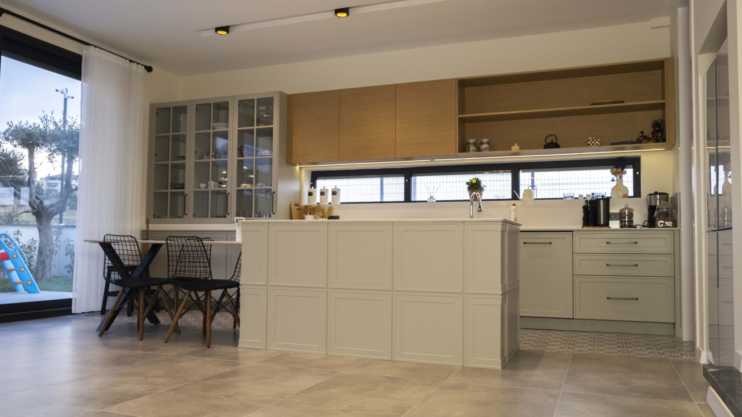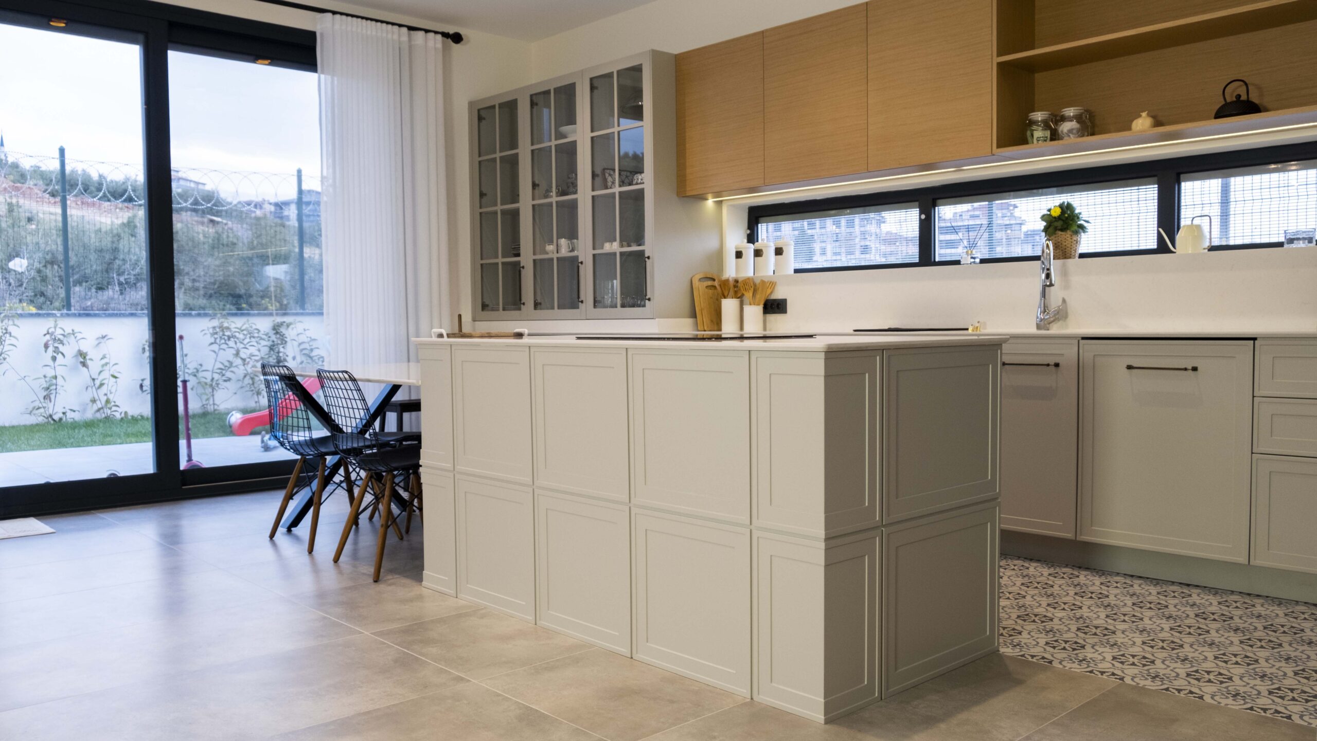 Mutfakta kullanılan açık tonlu dolaplar ve doğal ahşap kaplamalar, geniş pencere açıklıklarıyla birleşerek ferah bir atmosfer oluşturuyor. Zeminlerde tercih edilen özel mermer uygulamaları mekâna hem estetik hem de dayanıklılık kazandırıyor. Ahşap merdivenlerde ise sade ama karakterli bir görünüm elde etmek için özel tasarım kaplama tekniklerikullanıldı.