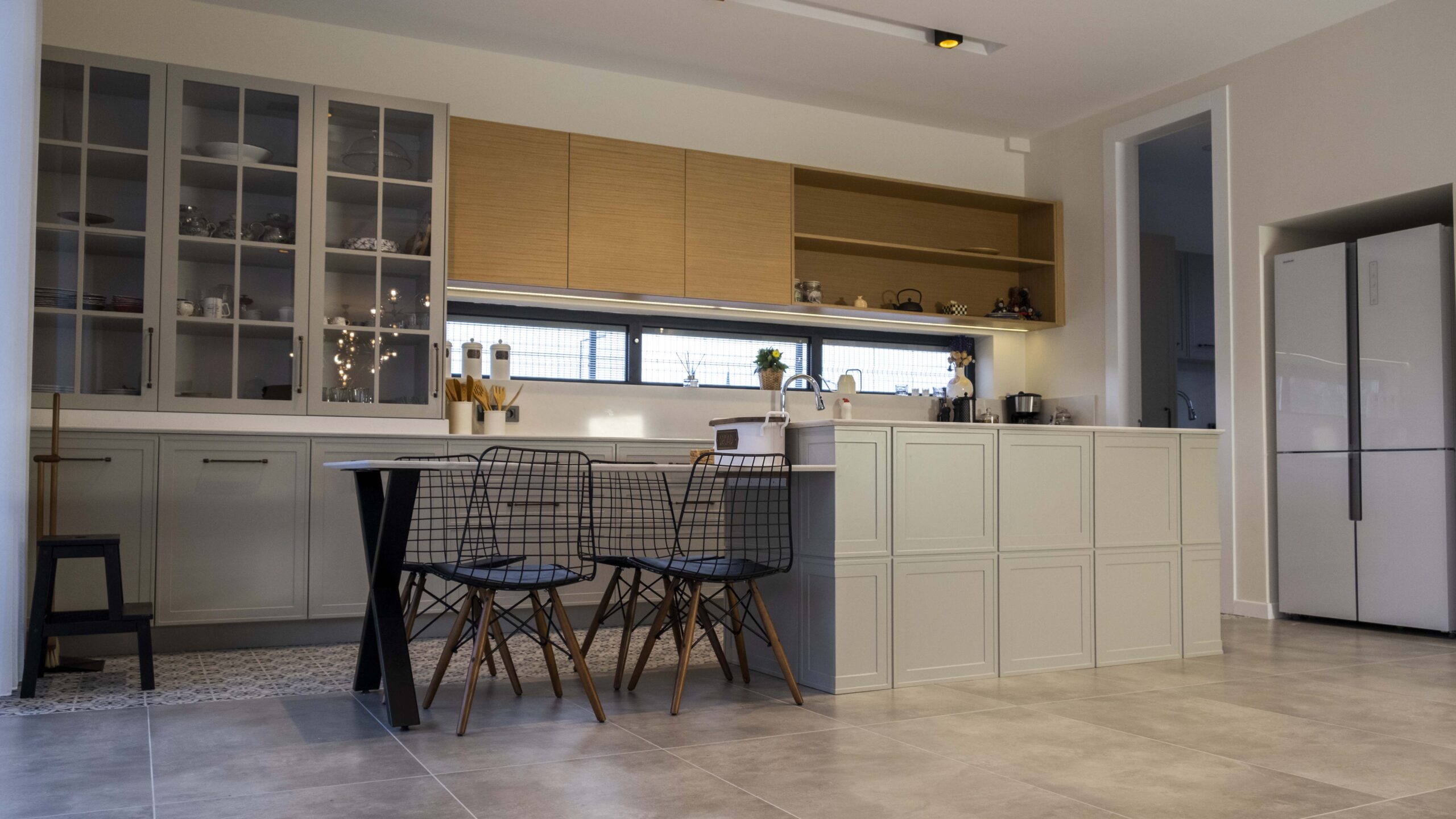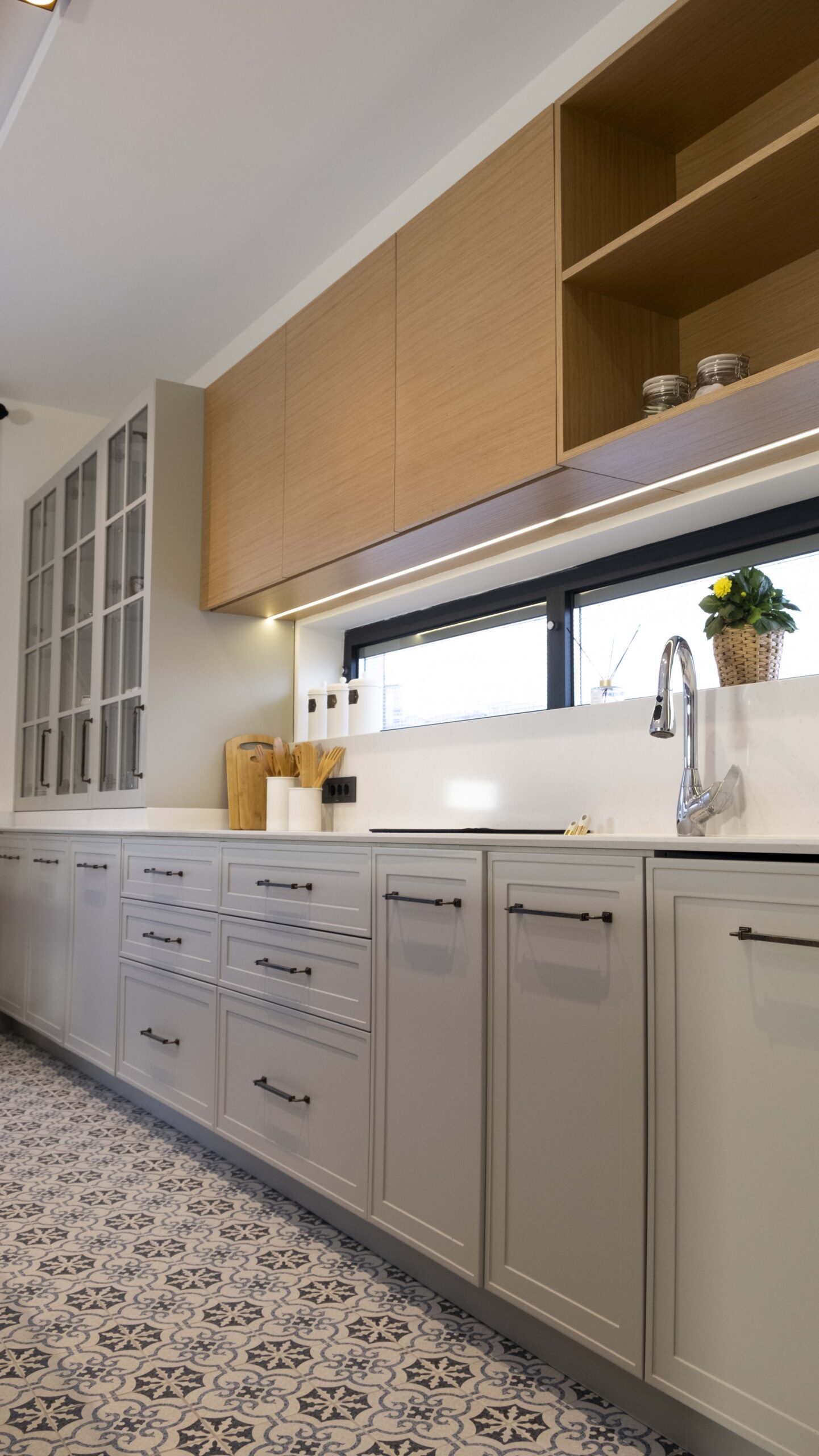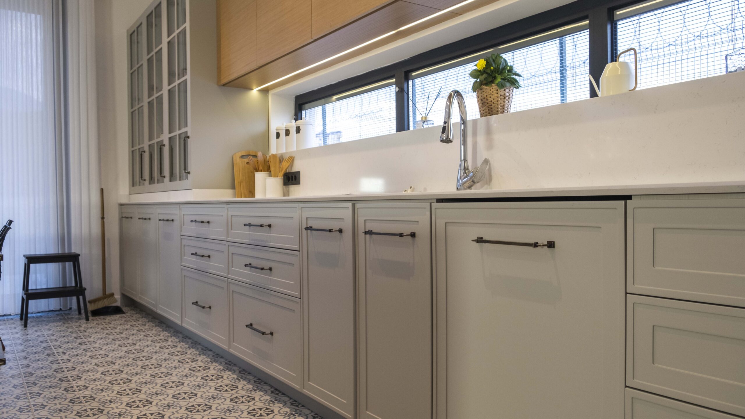 Mutfakta kullanılan açık tonlu dolaplar ve doğal ahşap kaplamalar, geniş pencere açıklıklarıyla birleşerek ferah bir atmosfer oluşturuyor. Zeminlerde tercih edilen özel mermer uygulamaları mekâna hem estetik hem de dayanıklılık kazandırıyor. Ahşap merdivenlerde ise sade ama karakterli bir görünüm elde etmek için özel tasarım kaplama tekniklerikullanıldı.