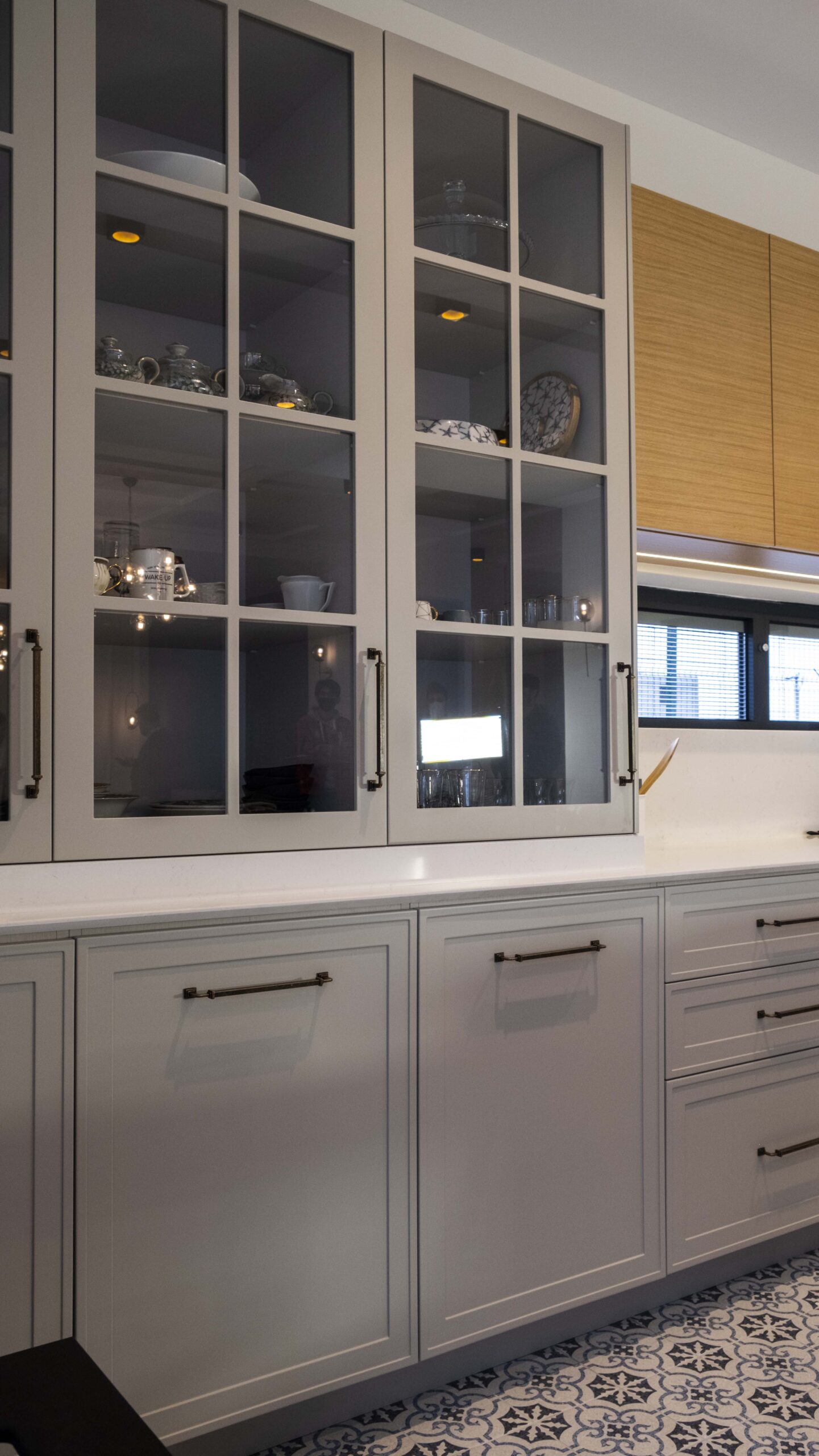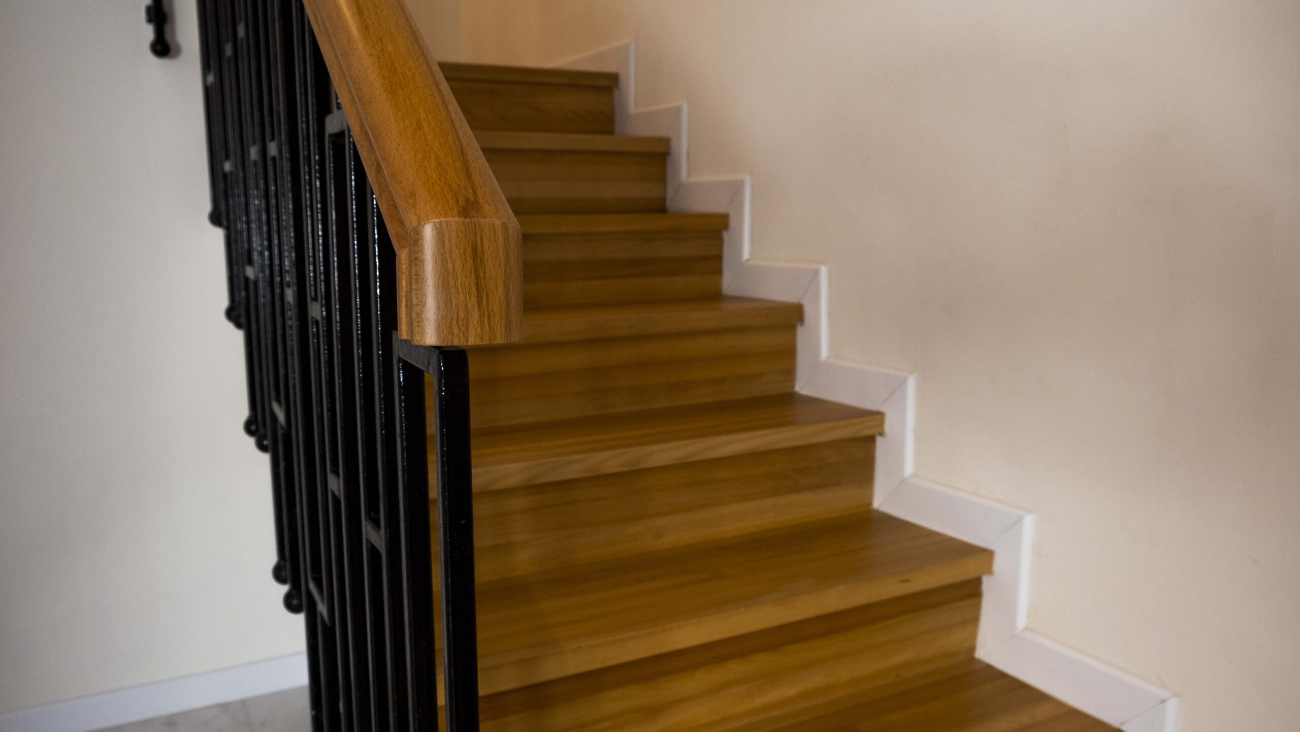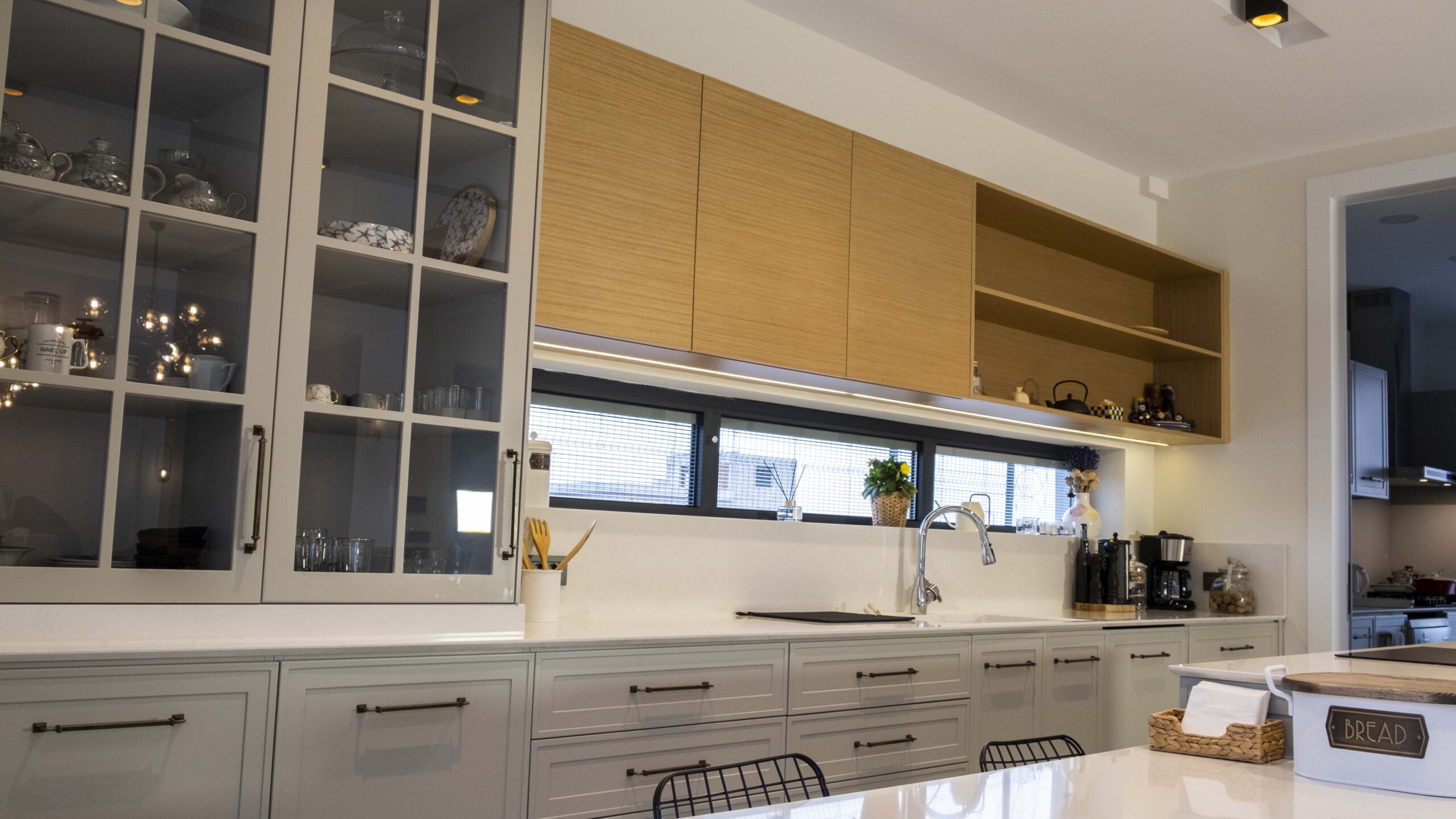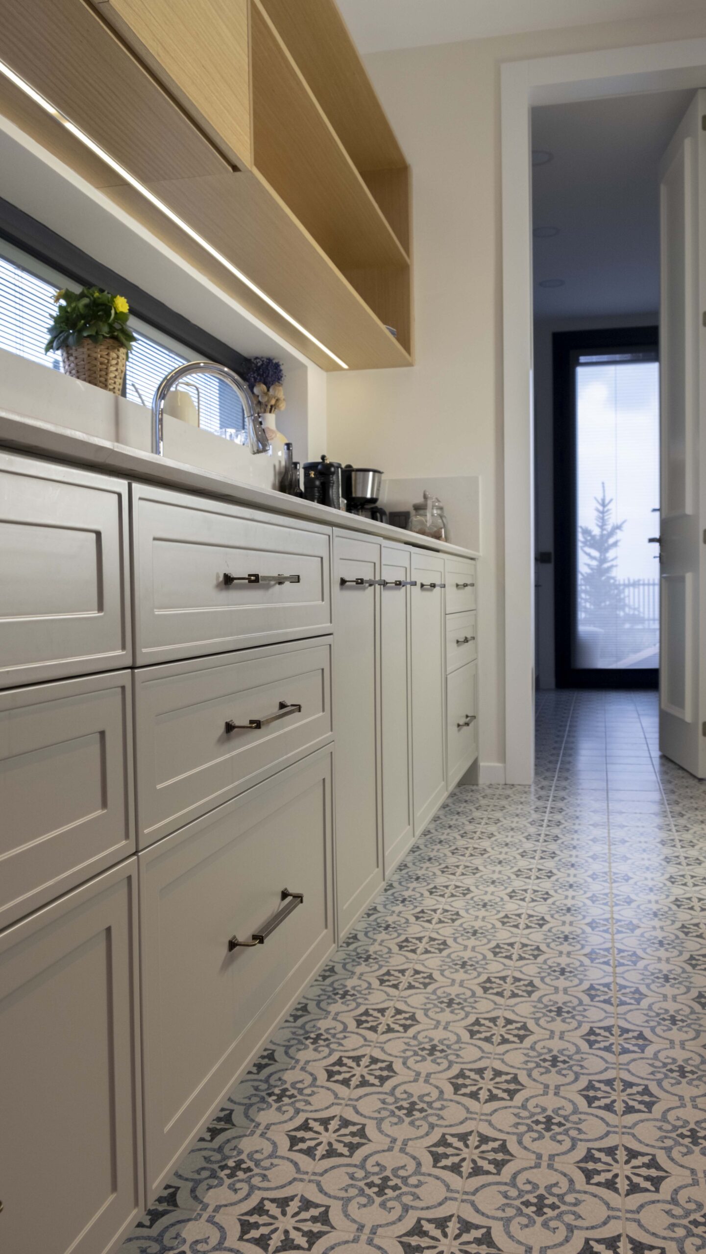 Mutfakta kullanılan açık tonlu dolaplar ve doğal ahşap kaplamalar, geniş pencere açıklıklarıyla birleşerek ferah bir atmosfer oluşturuyor. Zeminlerde tercih edilen özel mermer uygulamaları mekâna hem estetik hem de dayanıklılık kazandırıyor. Ahşap merdivenlerde ise sade ama karakterli bir görünüm elde etmek için özel tasarım kaplama tekniklerikullanıldı.